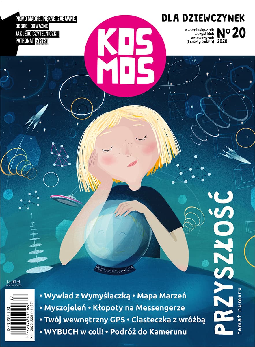 Na stanieZajrzyj do tego numeru, który zaraża dobrą energią. I pokazuje, że w życiu bardzo, bardzo wiele rzeczy zależy od ciebie. „Kosmos” wierzy, że dziewczynki mają wielką moc i przyszłość należy do nich. A opowiada o tym między innymi Milena – hokeistka z Oleśnicy (jedyna dziewczyna w swoim zespole), Gabrysia z Michałowic – która ciągle coś wymyśla. W tym numerze dowiesz się też, jak działa sztuczna inteligencja i jak zrobić kruche ciasteczka z wróżbą. A może zamiast postanowień noworocznych – wykonasz z „Kosmosem” Mapę Marzeń na rok 2021? Piękna rzecz do powieszenia w pokoju. W środku znajdziesz też: