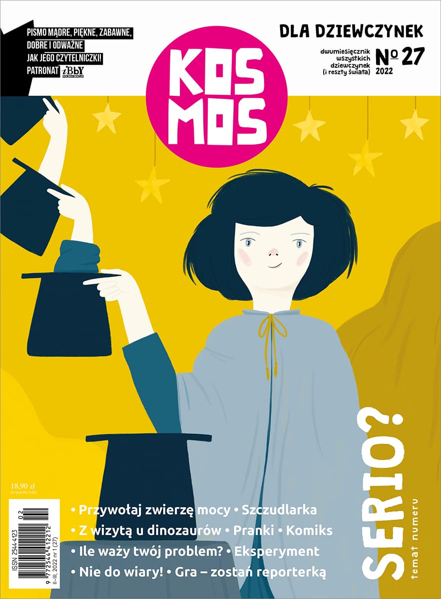 Na stanie„Kosmos dla dziewczynek” pomaga w takich sytuacjach przywołać moce dzikich zwierząt. Dają siłę do walki o to, co dla Czytelniczek ważne. Ten numer podpowiada też, jak zważyć swoje problemy i tymi mniejszymi się nie kłopotać. Pozwala spotkać wspaniałe kobiety, dla których dociekliwość to sposób na życie (reporterska planszówka). „Kosmos” zadziwia, rozbudza ciekawość i bawi – bo w końcu nie wszystko musi być tak strasznie serio!