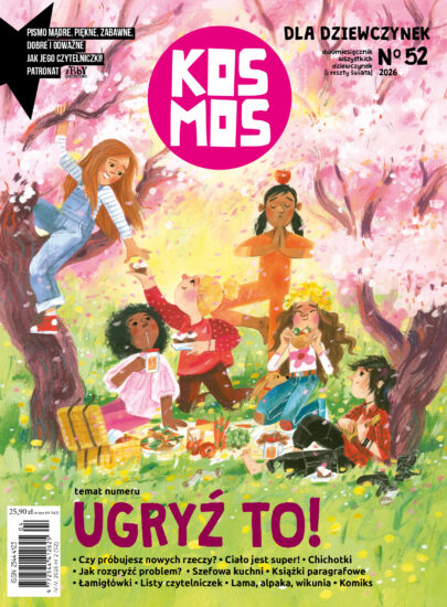 Dużo w tym numerze łamigłówek i zagadek – świetnych na rozgrzewkę. A ponieważ w tytule jest gryzienie, musi być też sporo o jedzeniu! Szczególnie że nowe smaki dla wielu osób bywają wyzwaniem. Opowiadają o tym: Ania Starmach, szefowa kuchni, znana między innymi z telewizyjnego programu MasterChef, i sześć dziewczyn, które zaprosiły do kuchni „Kosmos” i… wszystkie czytelniczki!